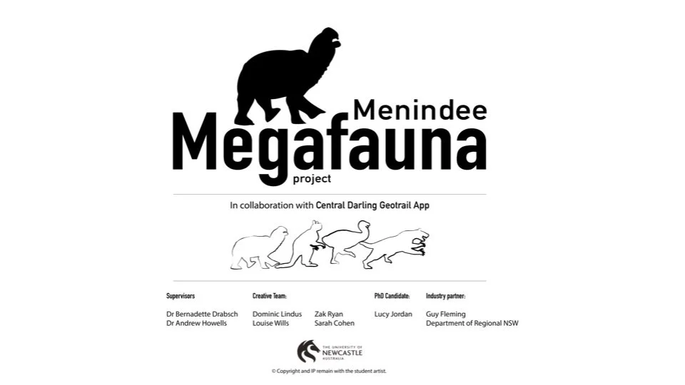 An off-shoot project from the Central Darling Heritage Trail App and the Darling/Barka Geotrail app was the Menindee Megafauna Project. The reconstruction of the megafauna paleo-environment was done as a supervised work integrated learning project. The large scale model is now on display at the Menindee Visitors’ Center. It features 3D digitally modelled and printed megafauna by Dominic Lindus, situated in a paleo-landscape made by Louise Wills.